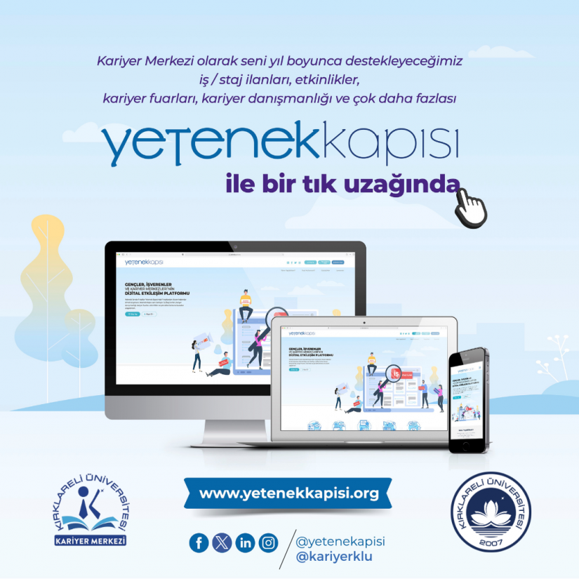 ![]() | YETENEK KAPISI KARİYER PLATFORMUNA KAYIT DUYURUSU Kariyer Uygulama ve Araştırma Merkezi 23/09/2025 2591 Okunma Cumhurbaşkanlığı himayesinde geliştirilen Yetenek Kapısı Kariyer Platformu, Kırklareli Üniversitesi... |
