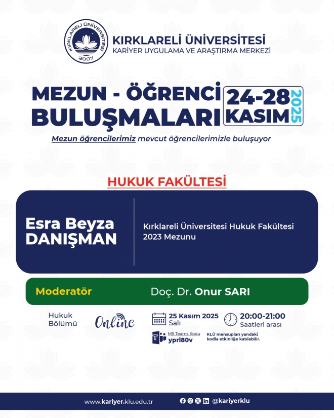 Üniversitemiz Kariyer Uygulama ve Araştırma Merkezi Koordinatörlüğü ile birlikte düzenlenen, Mezun-Öğrenci Buluşmaları kapsamındaki etkinliğimiz, Doç. Dr. Onur SARI moderatörlüğünde gerçekleştirilmiştir.