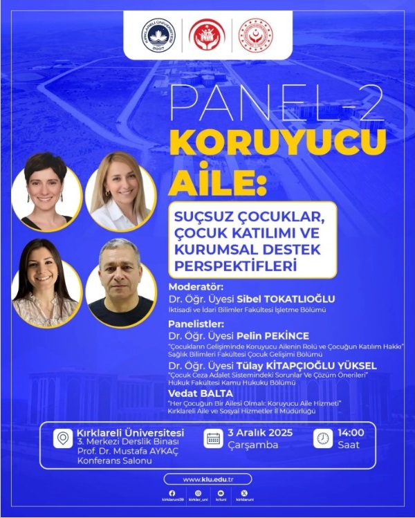 Üniversitemiz ile Kırklareli Aile ve Sosyal Hizmetler İl Müdürlüğü iş birliğiyle, 2025 Aile Yılı etkinlikleri kapsamında “Koruyucu Aile: Suçsuz Çocuklar, Çocuk Katılımı ve Kurumsal Destek Perspektifleri” başlıklı panel gerçekleştirilecektir.